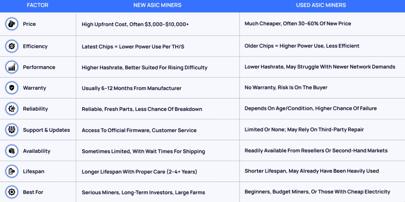 Many manufacturers offer a 6-12 month warranty on new ASIC miners. If something breaks, you can get it repaired or replaced at no additional cost. This type of protection is rare with used miners, making the newer option a lot less risky.